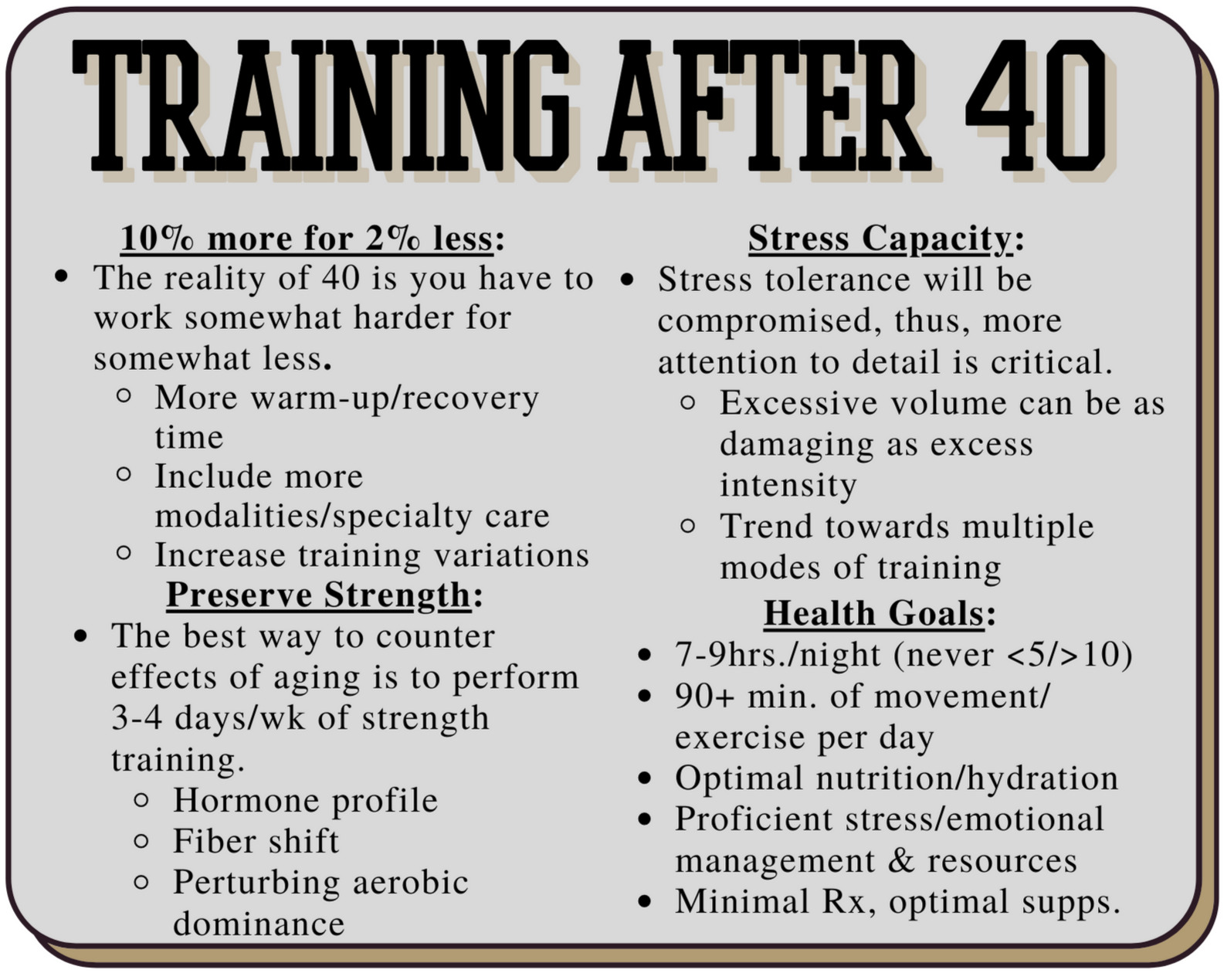 And finally adding to the mix, the general shifts in collective life stress that tend to occur in our 40’s, indirectly become training factors. Broadly speaking, people in their 40’s are raising young kids, have higher level jobs that come with increased pressure/stress, and they also tend to be spread very thin across multiple endeavors/commitments. Acknowledging the importance of sleep, hydration/nutrition, stress and emotional management, and consistent recovery/therapeutic modalities become much more significant once athletes/individuals are over the hill. Of course these items are important for any athlete at any age, however, as we get older this essential list becomes increasingly important to manage.