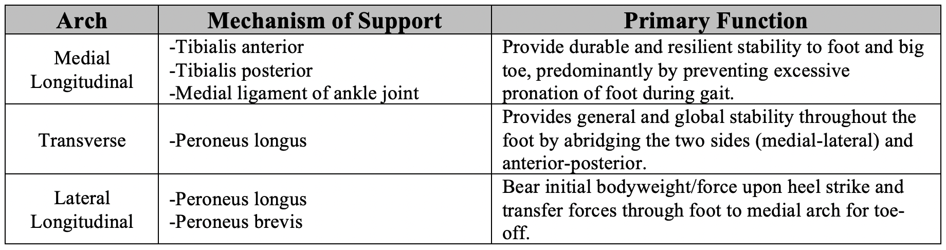 In addition to segments, we also have three prominent arches of the foot. Collectively the arches of the foot are responsible for distributing weight appropriately across the foot and absorbing and expressing forces throughout dynamic action. These arches include the transverse, and the medial and lateral longitudinal arches (shown above). As you’d assume, each of these arches have distinct functions/responsibilities: (catching a theme here yet…?)