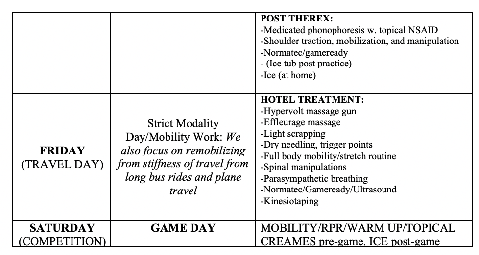 I typically include a separate home exercise program for each of my athletes. It includes only a handful of exercises for extra cuff work that can be done without my assistance just to get another quick session of muscle activation work at home. This is to be done in the evening before bed when we are not traveling. This promotes continued micro dosing rehab sessions over time.
