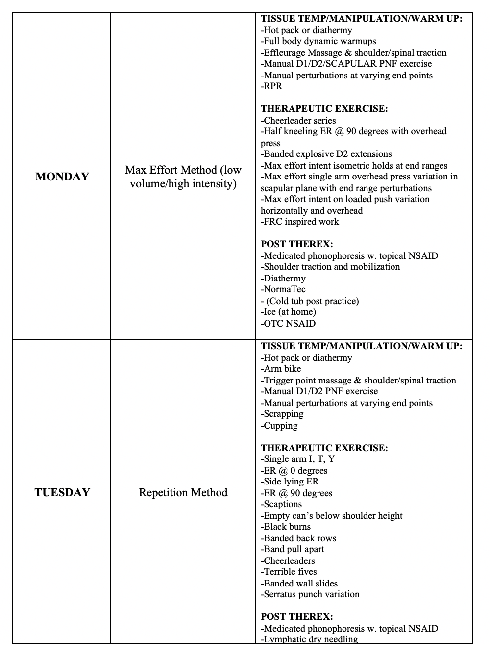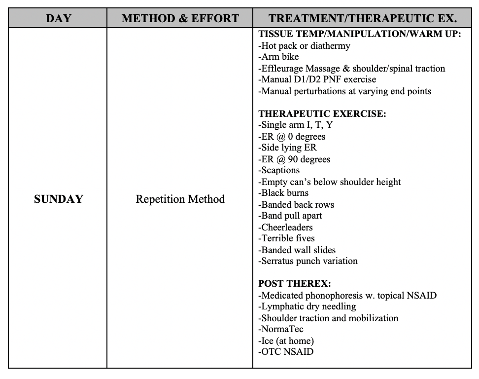 Occupation and sport will demand different needs, but in a rehab world I’m thinking, how can I bullet proof the area I’m rehabbing? I need to make sure that the body part accepts max force from external forces and make sure the body part can produce and redirect forces in different and awkward planes. The conjugate system is a way to monitor total volume, central nervous system load, recover better from the previous rehab session, and vary the modes of intent. In my work, it provides a great way to optimize rehab over the course of a competitive calendar year.