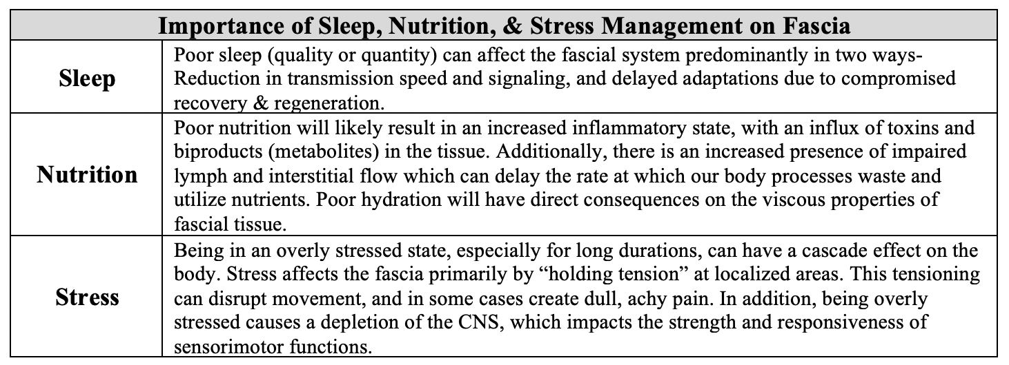 Nutrition, sleep, and stress/life management are all critical factors for athletes. A simple way of understanding the significance of stress accumulation is to think of stress as a single pool. This pool, however, has multiple pipes that feed into it. Meaning, your biochemistry doesn’t (really) differentiate between emotional, cognitive, and physical stress, it just recognizes that you’ve overwhelmed the system and it needs to fight back. I could literally write a whole damn paper on this piece itself, but to keep this brief, mismanagement of nutrition, sleep and stress will inherently place a threshold on how much the athlete will get out of training. As these apply specifically to the fascia, see the chart below.