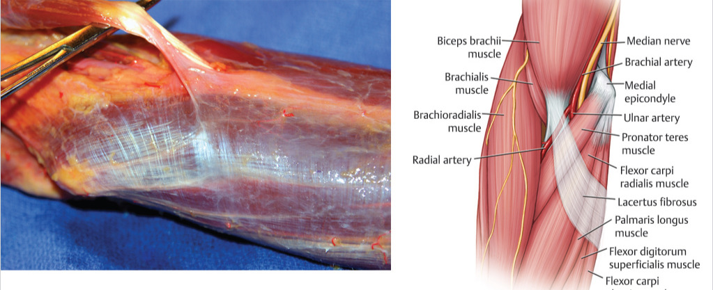 Figure 2- A picture of cadaveric fascia as compared to a typical illustration we see in textbooks. As you can notice, there is not a clean and neat separation between tissues or structures as our animations suggest. (Image via: Musculoskeletalkey.com)
