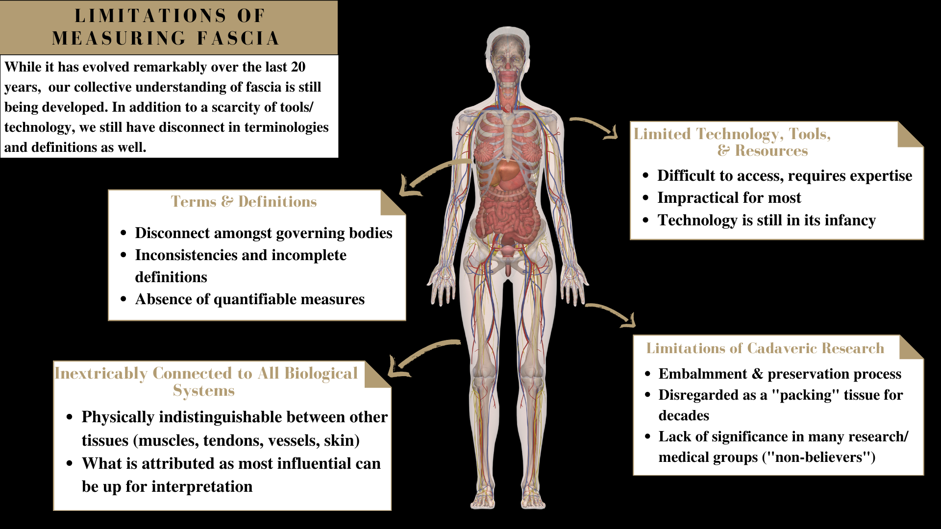 To expand a bit on the cadaveric point, recall that fascia is a living tissue, implying that when we die the tissue erodes away shortly thereafter. The conventional process of cadaveric studies includes bodies that have been embalmed, which is a process that uses formaldehyde (among other chemicals) to preserve the structures. It should be very clearly understood what embalming does to the cadaver, and a part of this is denigrating the fascial tissue while also dehydrating the other tissues and vessels (3). I am not stating outright that because of this embalming process our cadaveric research is invalid, however, I would challenge that it has provided a distorted and perhaps incomplete view of anatomy and physiology, particularly for fascial tissue. All of that is to say, a major reason why fascia is difficult to assess and measure in the practical sense is because even at the top research level, we’re still way behind the curve on understanding it as a whole.