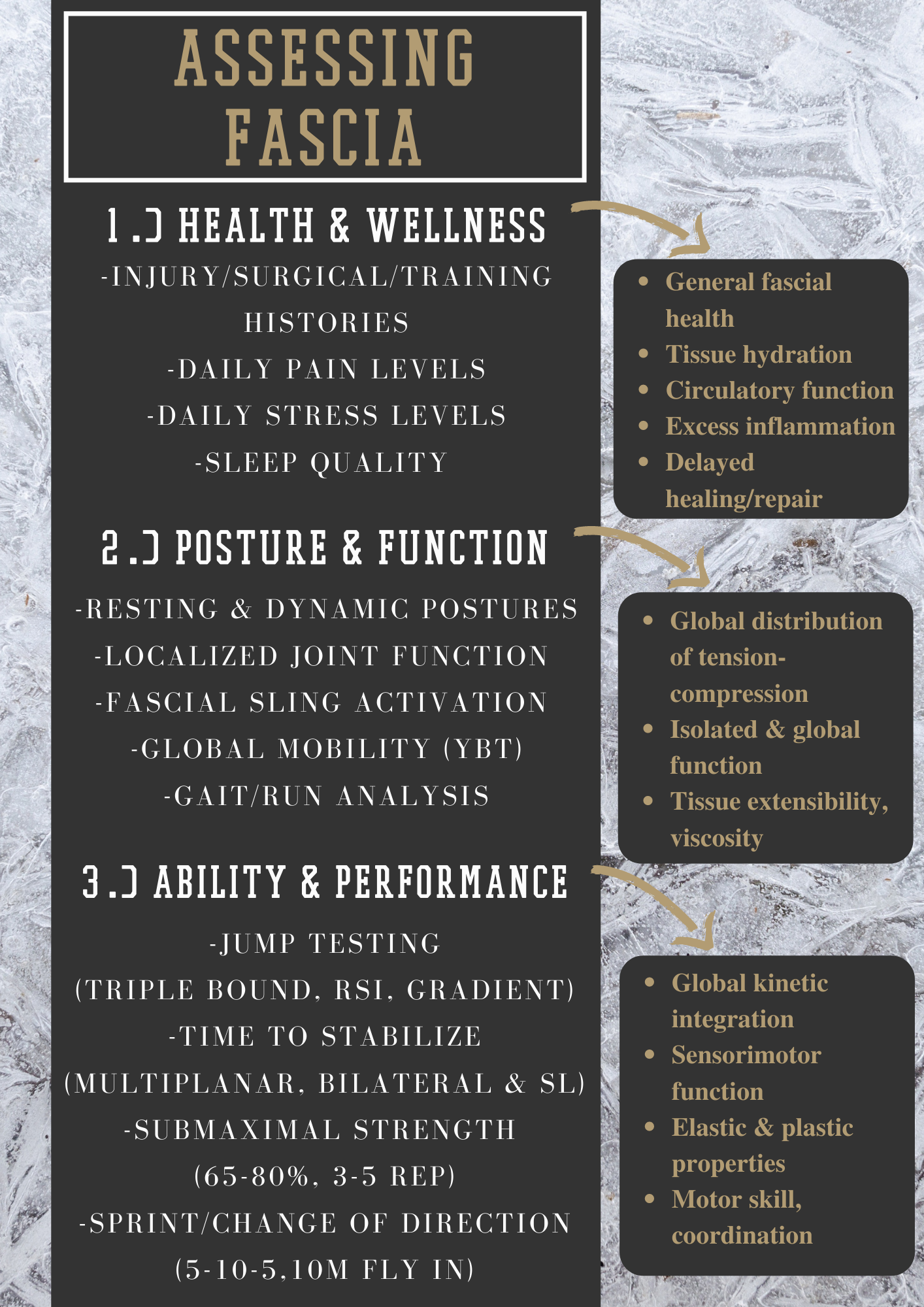 In summary- use a multitude of assessment points, that are within your ability and scope of practice, and utilize what you collect to continue to help inform and shape your decision making to follow. Have a good understanding of how they move, feel, and how they are performing in sport/duty. From there, assess general tissue qualities, independent functions, and global integration. Improving fascial quality and function should be multifocal and include multiple modalities. How you train and assess don’t necessarily need to change, maybe just modified in a few spots, and looked at from a slightly different perspective.