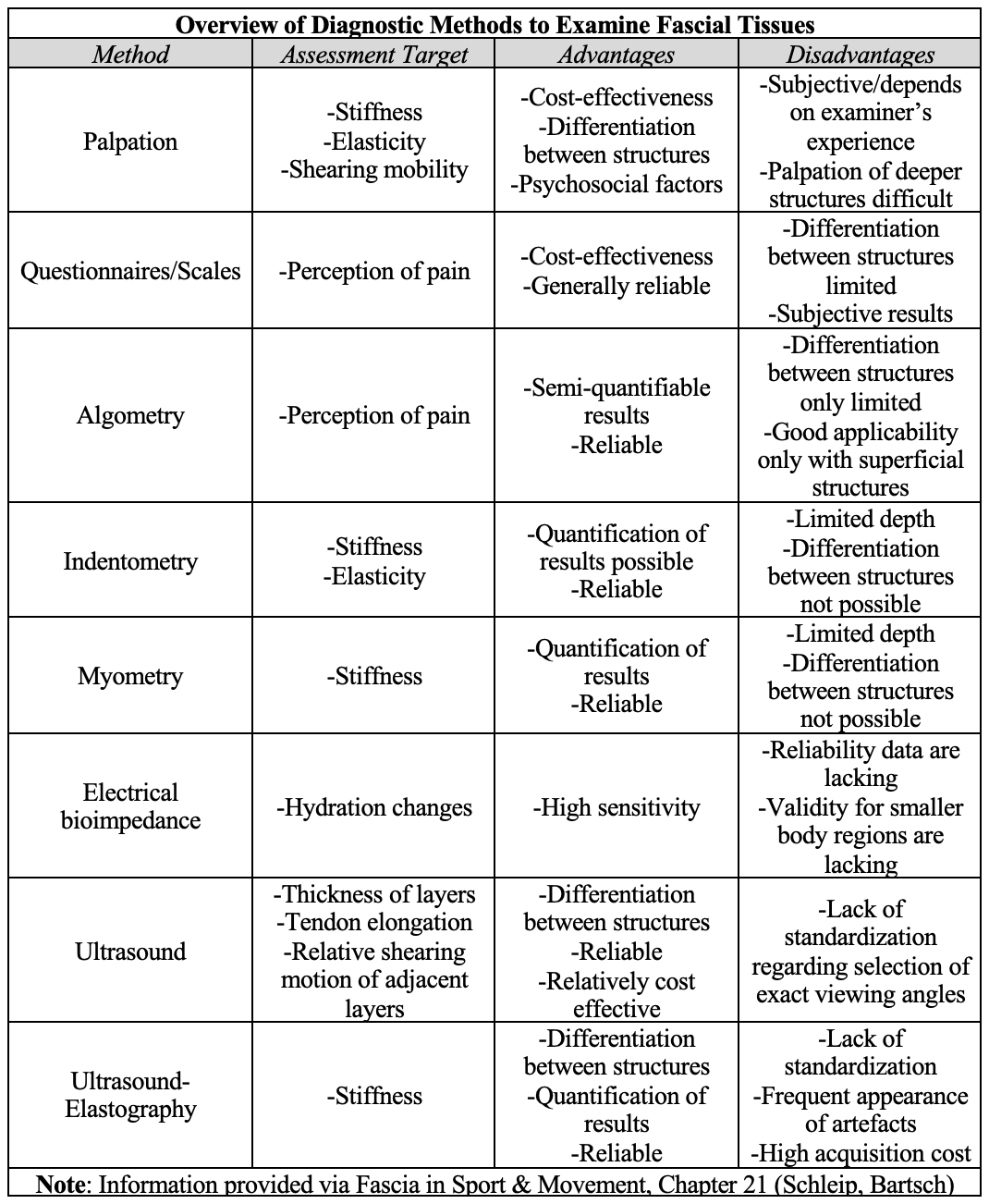 Despite the paragraphs above painting a grim picture, there are of course ways that we can glean insights to fascial improvements. Utilizing a chart provided from chapter 21 (Schleip, Bartsch) from the unbelievably resourceful textbook- Fascia in Sport & Movement (Schleip, Wilke), we can see there are a handful of clinical diagnostics designed to measure fascial function and improvement.