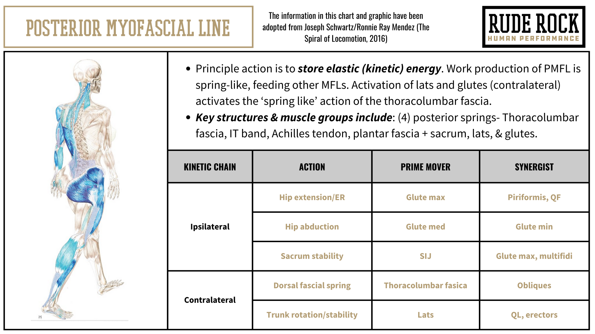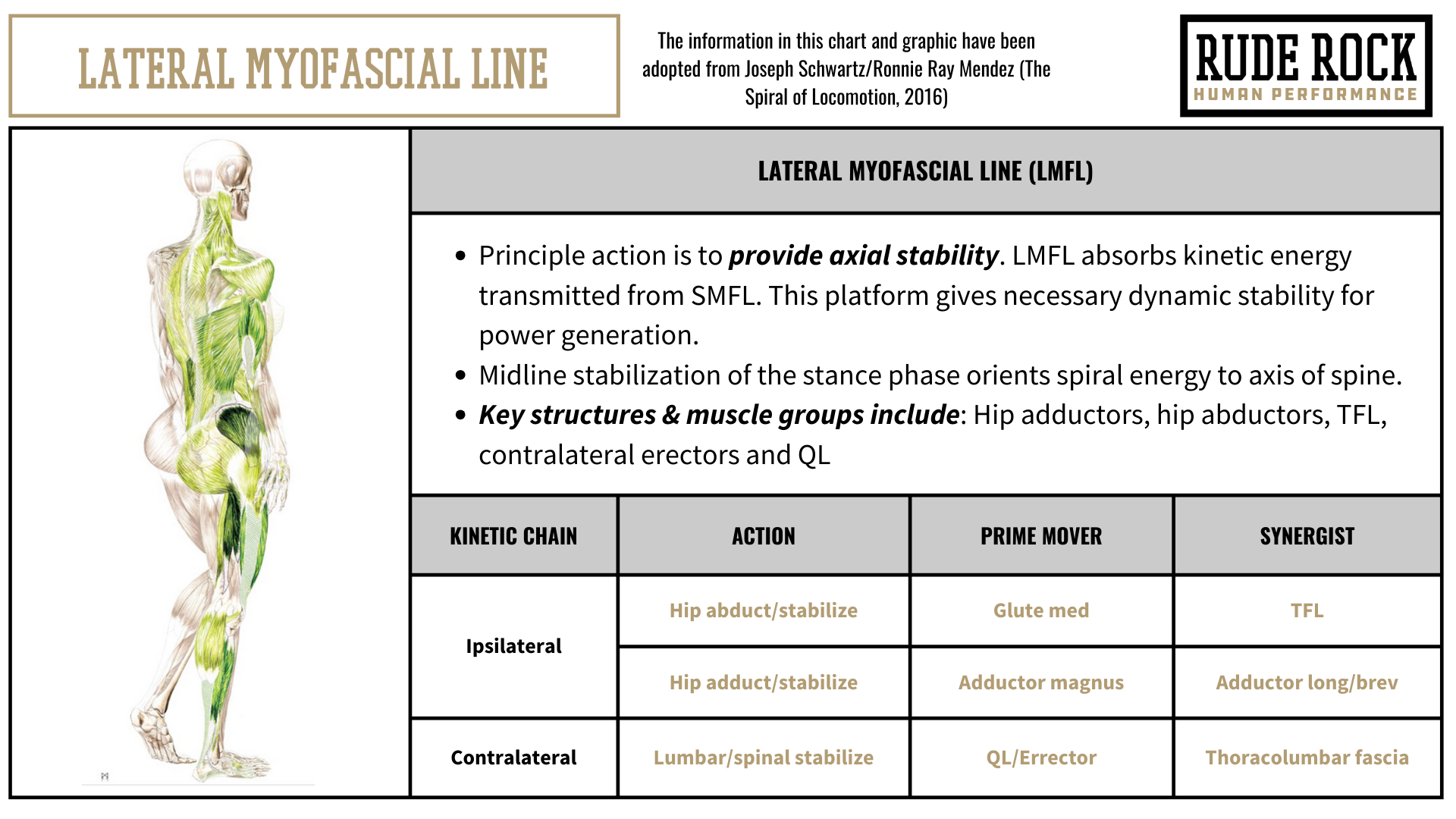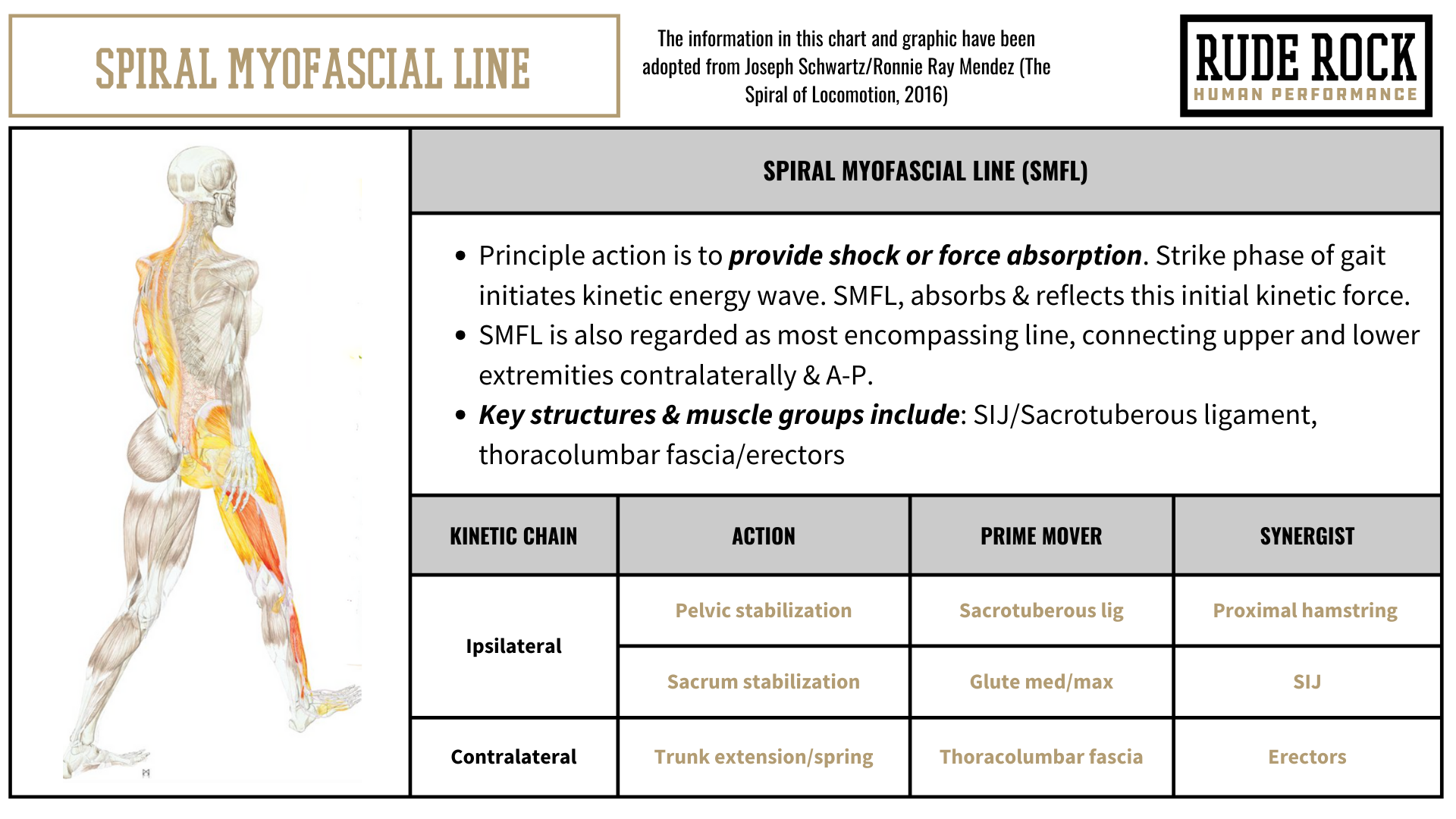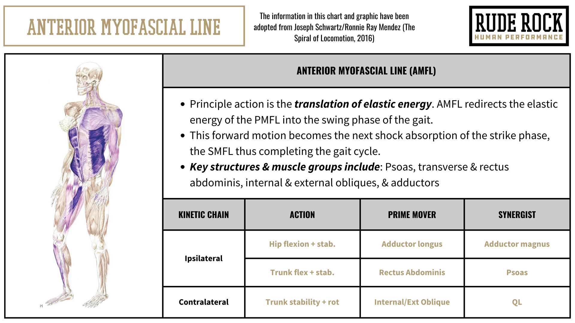 There are different definitions and descriptions of these myofascial lines, depending on the source or institution you look to. Nevertheless, the model I have adopted and presented in this are original to Joseph Schwartz, and in my opinion is the best reflection of these myofascial lines. A primary reason I think this is the best representation is how the line graphics are associated to phases of gait. I feel like this gives a little more practicality and vitality to the lines, making it a bit more practical and actionable. The individual graphics below are presented in the chronological sequence of how the myofascial lines are specifically activated during a gait cycle.