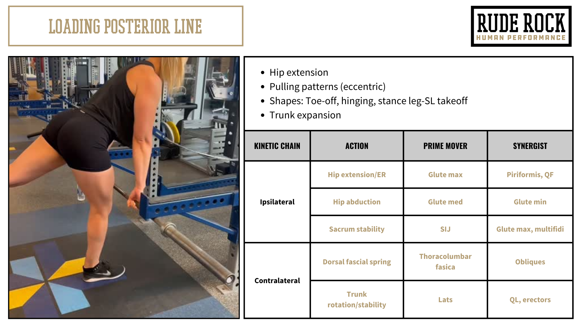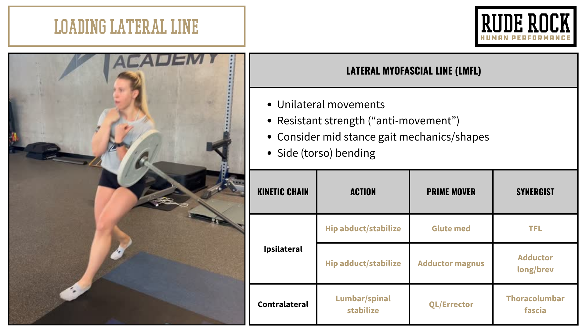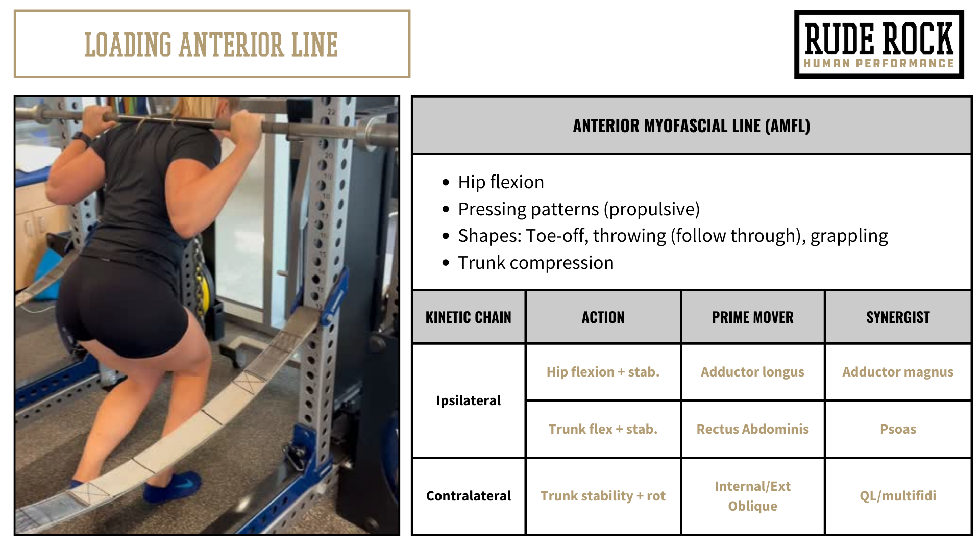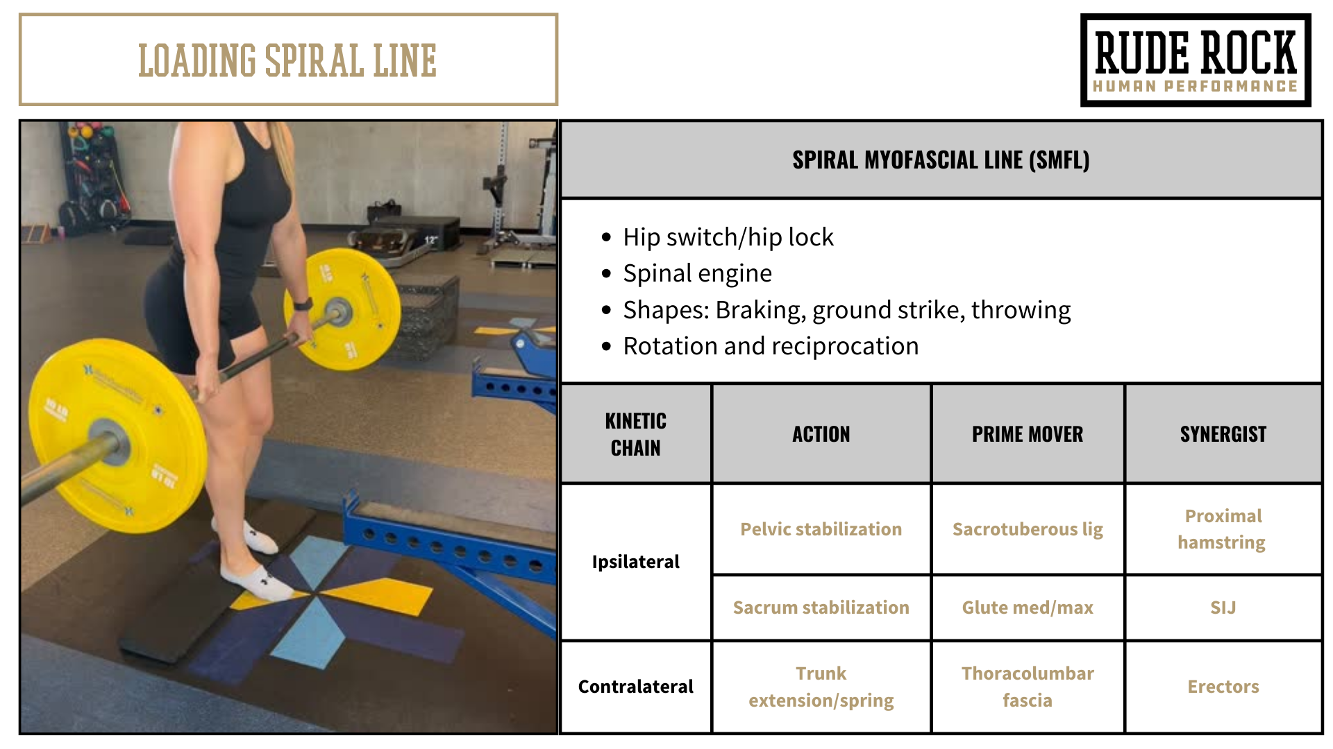 Sport is very rarely played from a bilateral stance, we have elements of compressive forces, but much of the stressors in sport are tensile in nature. Sport is dynamic, it’s fluid, its reactive. Speaking practically, emphasizing fascia in training does not require a dramatically different or “abstract” exercise prescription. We can simply take conventional movements (squat, hinge, pull, Olympic variations, etc.) and apply them through the lens of these primary myofascial lines. Meaning, I perform very little bilateral movements, incorporate a wide range of directions/planes of movement, and have a wide frequency of intensities, load types, and positions.