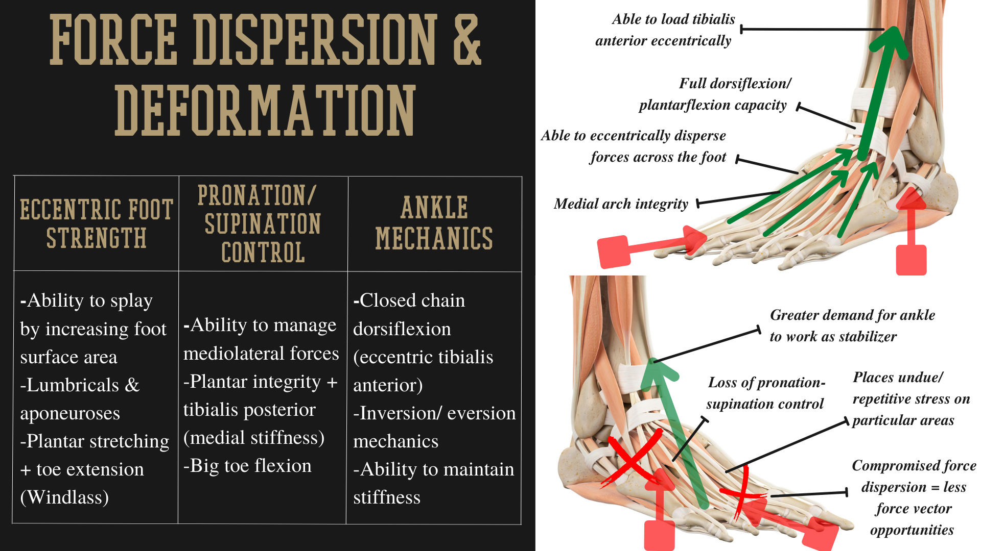 The foot is effectively the lock and key for kinetic integration and the foundation for force. If we are able to properly position and distribute pressure across the feet accordingly to the task at hand, we are fundamentally in a better position to have more complete kinetic integration up the chain. Another consideration is the rate at which force can be produced and tolerated when we are more grounded. The ability to properly eccentrically splay the foot is critical for sport performance. And a primary component to eccentrically splaying is having the requisite foot compliance to create more space to load through. Think about force interactions at the foot like a channel or a dam… narrow channel, higher force with less surface area to manage it. Wide channel, greater opportunity to evenly distribute volume or force. Ditch the shoes, watch force go up and soft tissue injuries go down.