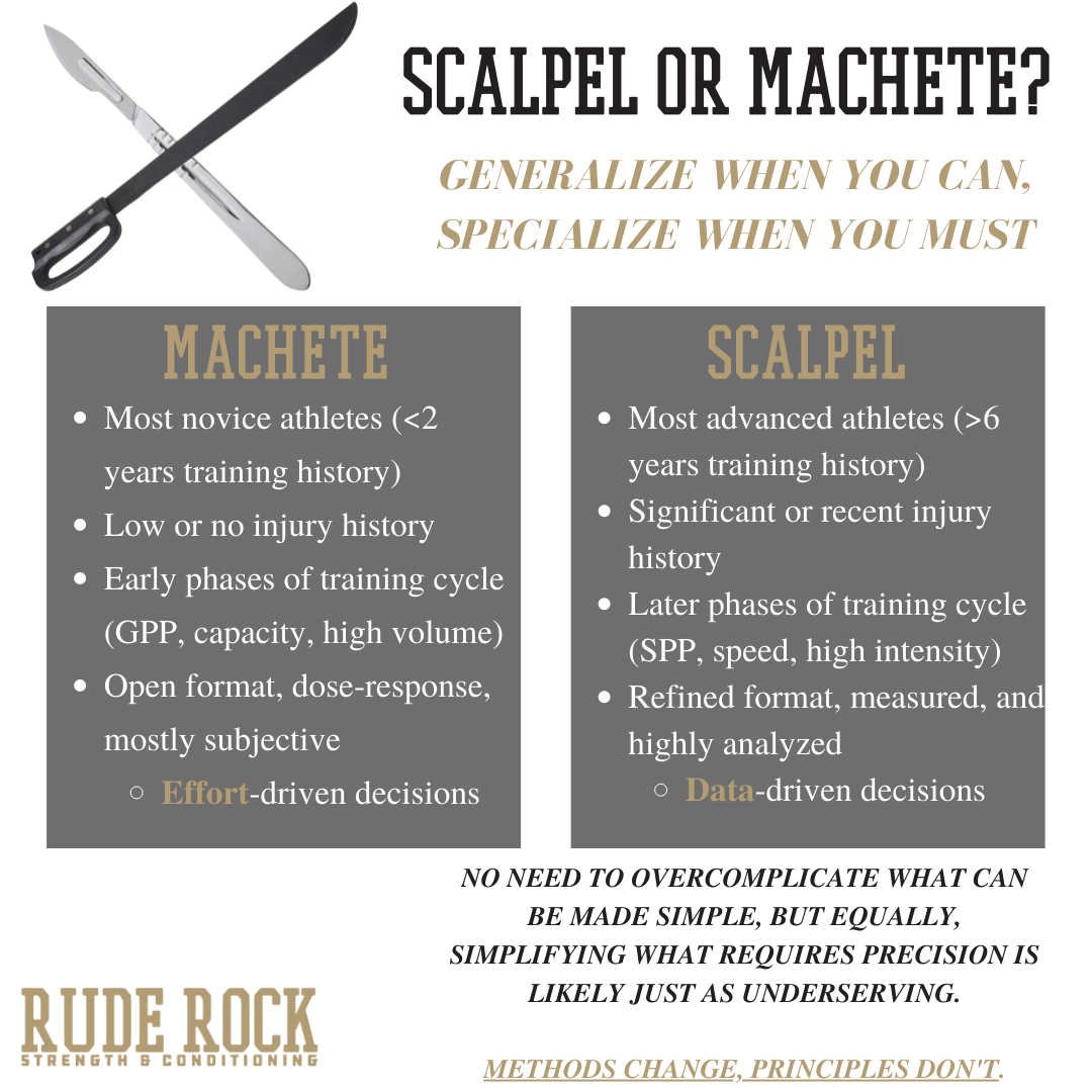 A great rule of thumb for strength coaches that I’ve adopted is to “generalize when you can, specialize when you must.” Adding a little visual element to this and we can think of it as “knowing when to be a scalpel and when to be a machete.” One of the everlasting debates amongst coaches is whether we should be masters of simplicity (redundancy with the basics) or if we should continue to see the boundaries of our practice as an expanding model. Like most things, I try to avoid the polarities and settle somewhere in the middle.