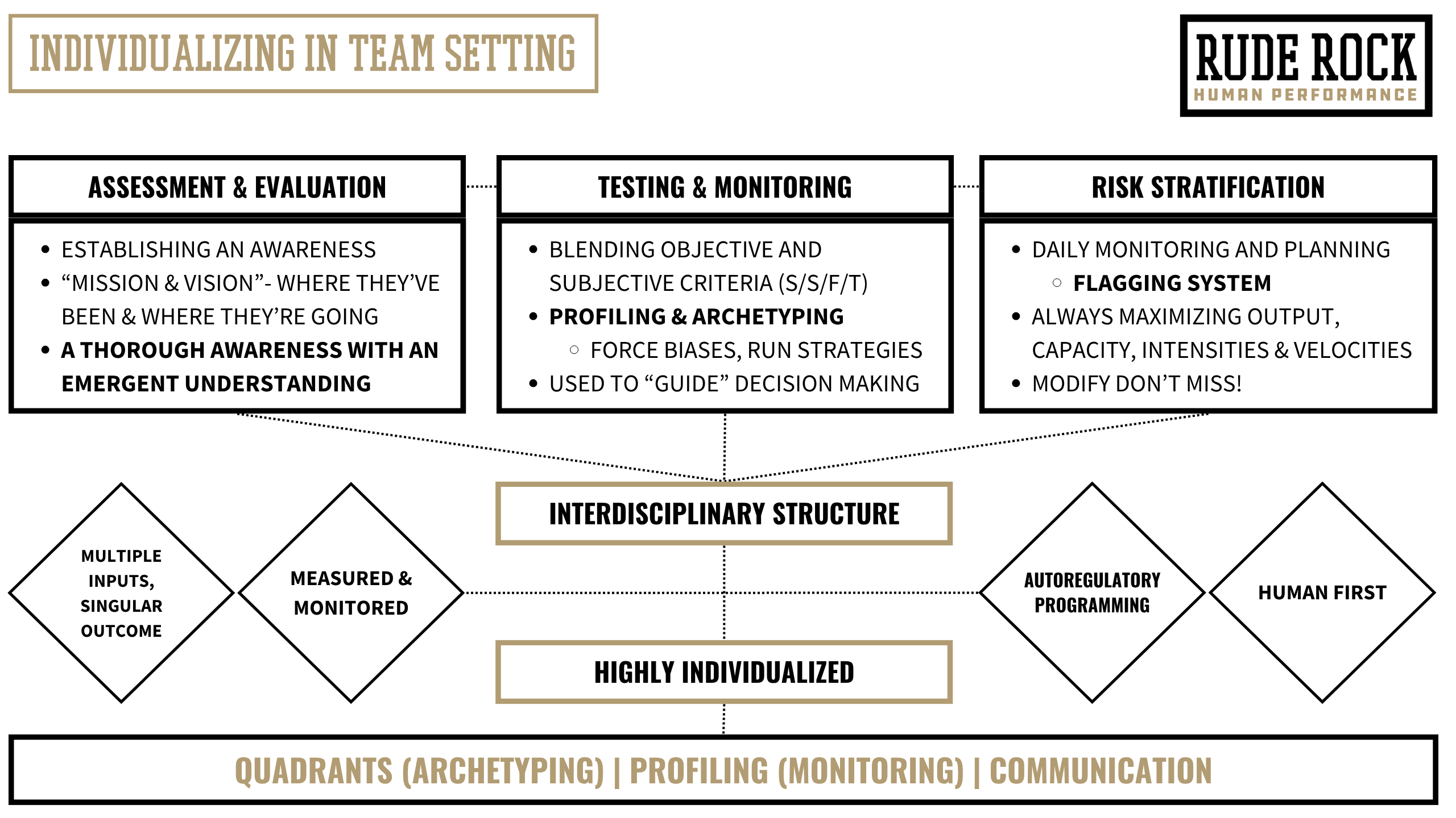 The strategies are variable and led by driving individualized athlete protocols within the team setting. There are a few areas, or components of the performance plan that specifically apply here- pre-session, modifying strength training parameters, post-session/homework, and for cueing and setting constraints. In order to be individualized, it requires a thorough intake process with a spectrum of data, information, and understanding of each athlete. We view the athlete intake process as requiring a thorough initial awareness that is followed by an emergent understanding. Once we’ve gathered enough data and understanding of the athlete, we are then able to develop a full scope profile for each athlete (i.e., archetyping).