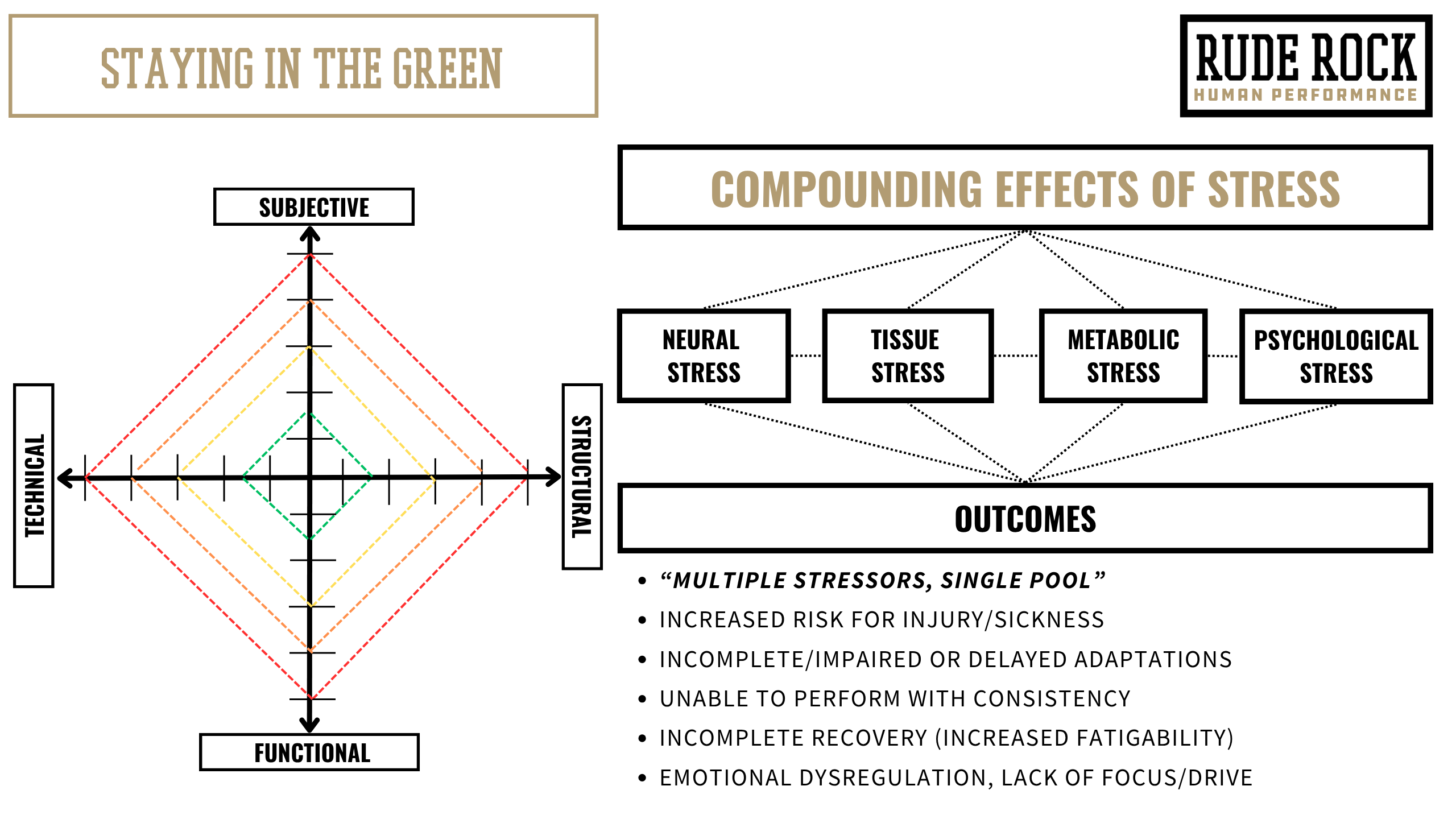 The route to staying in the green isn’t compromising the demands, but better strategizing for them. This requires strategizing from multiple lenses or points of performance (i.e., subjective/structural, functional, and technical), while also aiming to support athlete health on as much of an individual basis as possible. Balancing the body speaks to all aspects of training and performance- the energy systems, the CNS (SNS:PSNS balance), the motor patterns, and so forth.