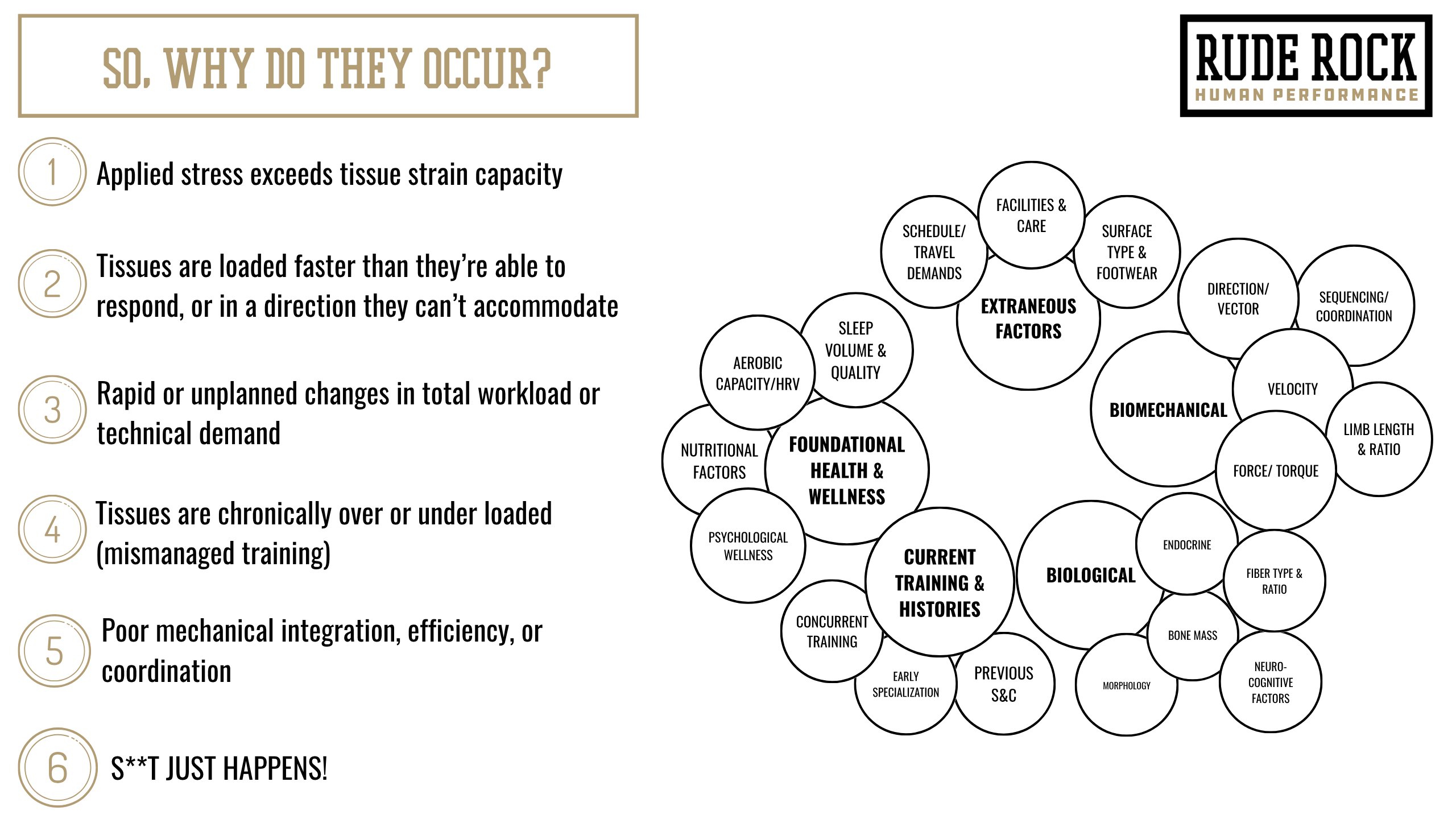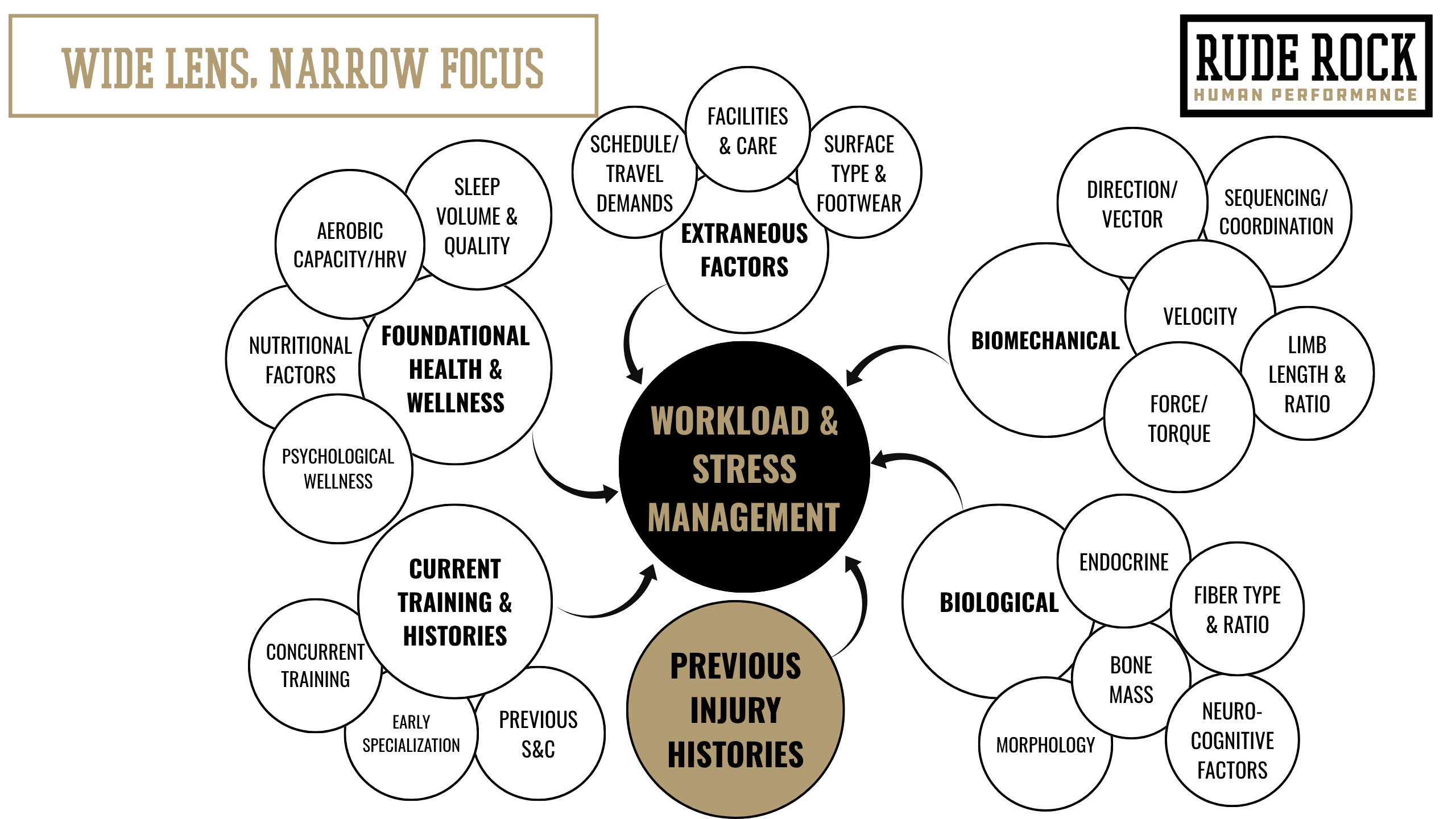 We can find solid research or evidence to support every one of the individual items listed on this graphic, however, we can almost certainly find something that suggests it doesn’t matter. Once again, injuries are uniquely complex, but even with this ambiguity, there is a clear consensus on at least two factors- workload/stress management, and previous injury history. Virtually all injury focused research ultimately points back to these two factors, and for that reason, has become a central consideration for us. We organize it as having several surrounding factors that are potentially significant, that feed into one or two central factors that certainly matter.