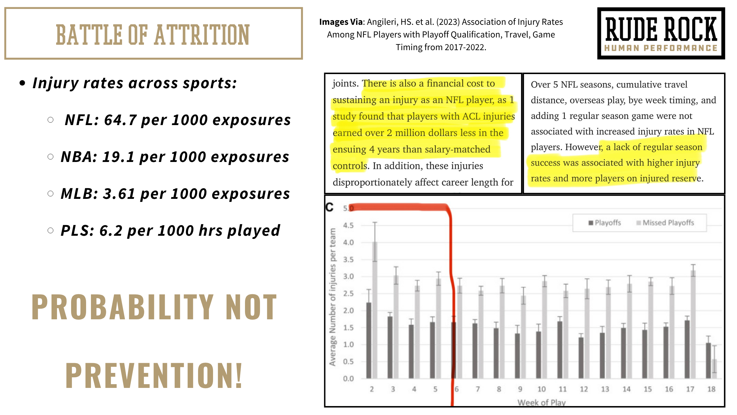 As the level of competition rises, the game becomes more and more of a battle of attrition- the athlete who stays the healthiest often has the best chance of continuing to play, just as the team who can stay healthiest is typically the one with the advantage. Techinical skill and physical capacities are of course important, but we cannot overlook the value health and regeneration provide an athlete. The chart shown in the graphic above is illustrating the injury rates by week in the NFL, and interestingly, this study was analyzing what factors are associated to injury rates. Across several variables they analyzed- schedule demands, travel, surface types, there was only one factor shown to be correlated to injury rates- winning. Meaning, teams that won, stayed healthier, and to that end, shows legitimate evidence that the best ability does become availability.