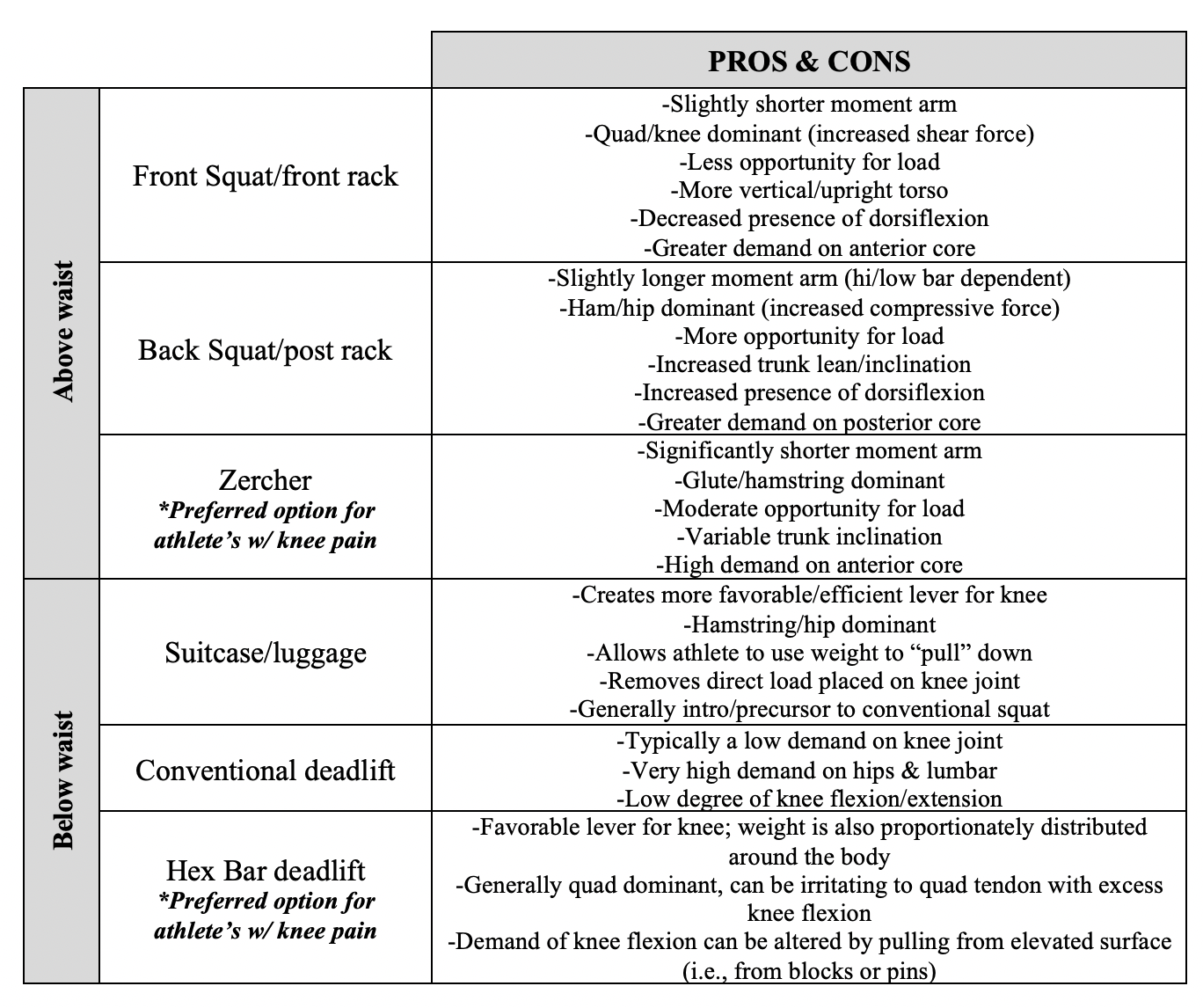 Broadly speaking, having the load above the waist is going to be more demanding on the knees. Mechanically this is because above the waist (i.e., goblet or front rack hold) creates a 3rd class lever, which is relatively inefficient for force production. Conversely, holding below the waist (i.e., suitcase or suspended hold) creates a 1st class lever which is more mechanically efficient. Speaking to the muscles, loading above the waist will largely be more quad dominant and increased stress on the quad tendon. Whereas loading below the waist is more hamstring dominant in nature. The chart below discusses some other common above/below waist loading strategies and their respective pro’s/con’s: